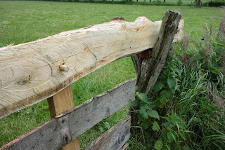 Vanaf de bovenkant ziet het hek er zo uit: een torretje of knagertje heeft achter de schors mooie slingerpaadjes in het hout geknaagd. We kunnen er hopelijk weer jaren tegen.